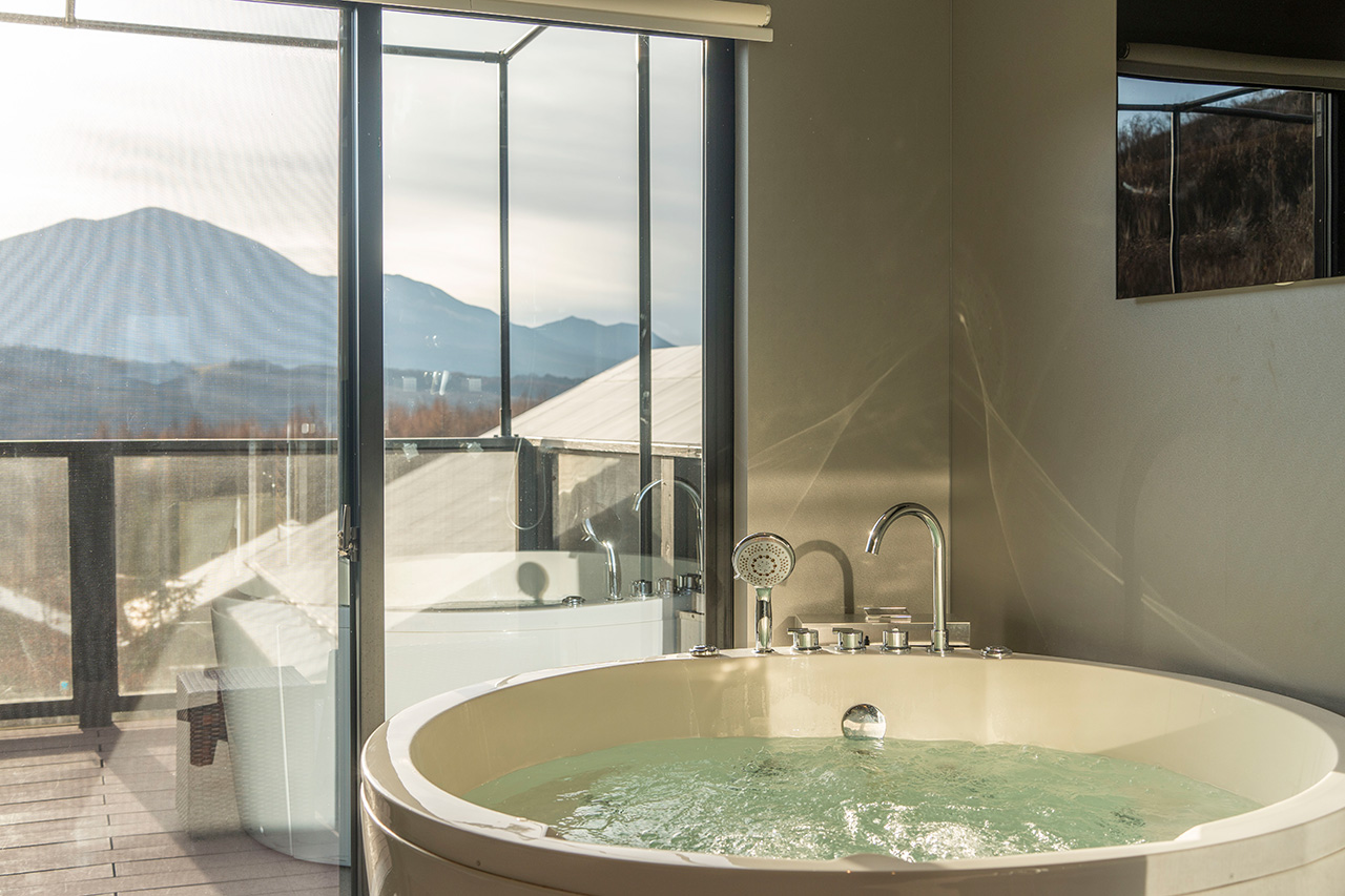 あさま空山望の最も大きな特徴が「全室浅間山ビュー」。軽井沢を象徴する標高約2,568 mの浅間山を、リビングから、ジェットバスからと、好きな場所から望むことができます。ジェットバスのお湯は山麓の地下水を水源とする「あさま天然水」。ジェットで身体をほぐす時間は、極上の癒やしでした。ちなみにプライベートサウナもあります!
