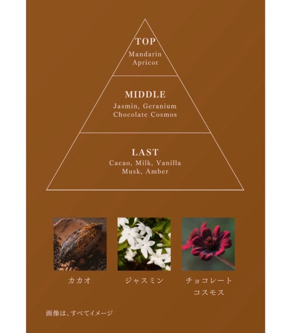 あまくとろけるようなリッチなカカオの香り。香りの一部に天然精油をブレンド。ふんわり広がるフローラルとミルクのあたたかみのあるあまさでほろ苦いカカオのリッチな香りを引き立てています。