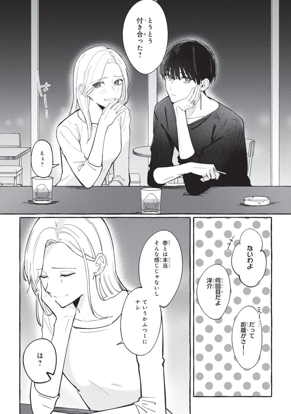 仕事のストレスを泰との晩酌で癒やす佳帆。「付き合った?」というツッコミを笑顔で否定する二人ですが、このまま友達関係は続くのでしょうか……?
