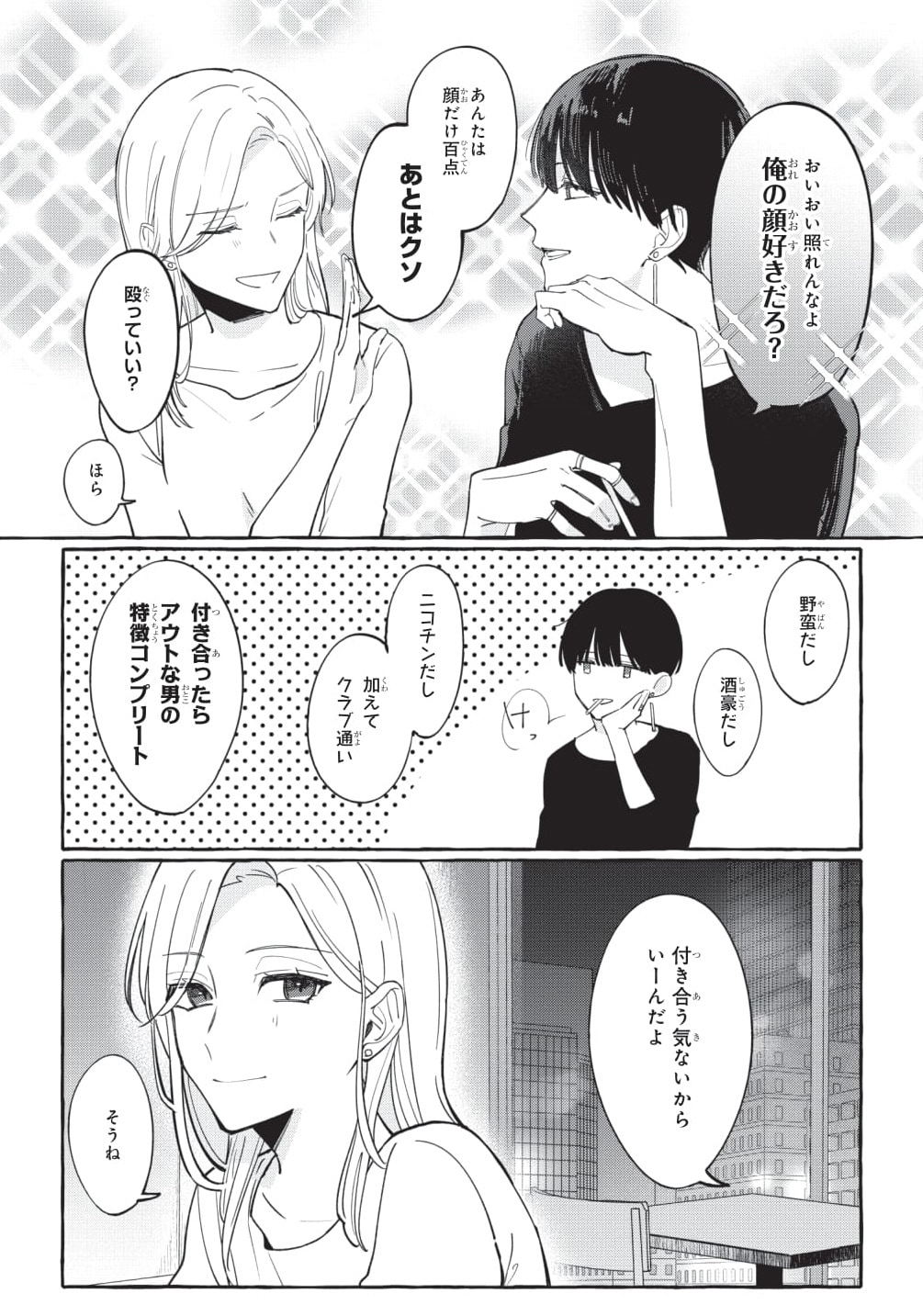 毎日仕事で忙しいOL・佳帆の唯一の楽しみは、バーで知り合った泰(あきら)という男とお酒を交わしながら気兼ねなく話すこと。三十路で童顔な泰だが、酒・煙草・女遊びも激しくクズ要素は満載。でも、友人としては良い関係を築けているはずだった……あの夜、一線を越えるまでは。