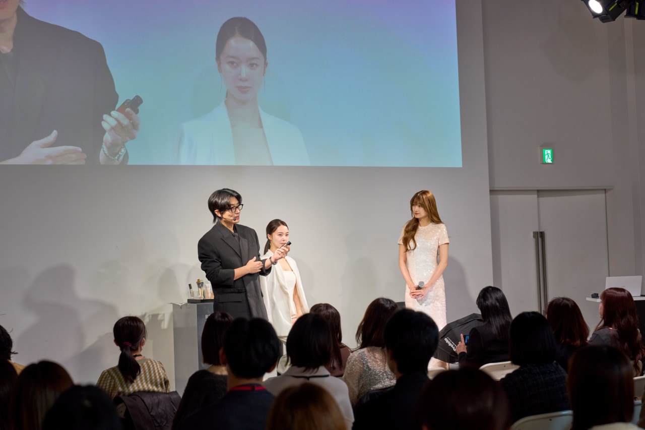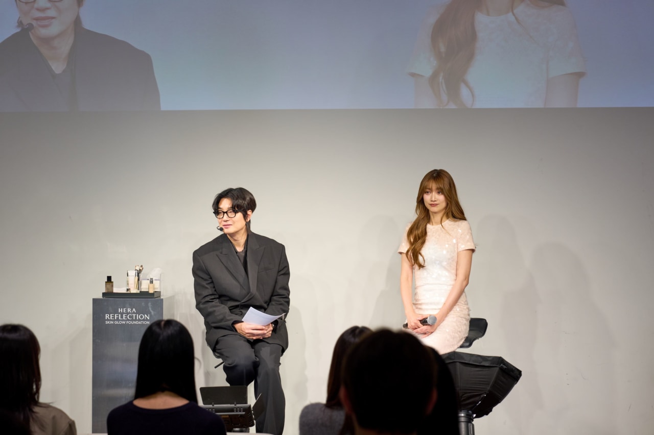 発表会にはモデルのヨンアさんと、HERA専属メイクアップアーティストのイ・ジンス氏も登壇。実際に新製品の「リフレクション スキングロウファンデーション」を使ったメイクデモンストレーションが行われました。