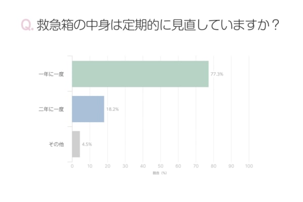 救急箱を備えている人のうち、定期的に見直すと回答した人は7割超え。そのうち、毎年見直していると回答した人は77.3%と、救急箱を自宅に常備している人はこまめに中身をチェックしていることが分かりました。