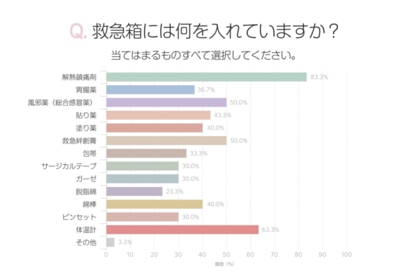 半数の人が総合感冒薬と救急絆創膏も入れていると回答しており、解熱鎮痛剤、体温計、総合感冒薬、救急絆創膏の4つは必須といえるでしょう。その他の回答としては消毒液と咳止めのシロップを挙げる人がいました。