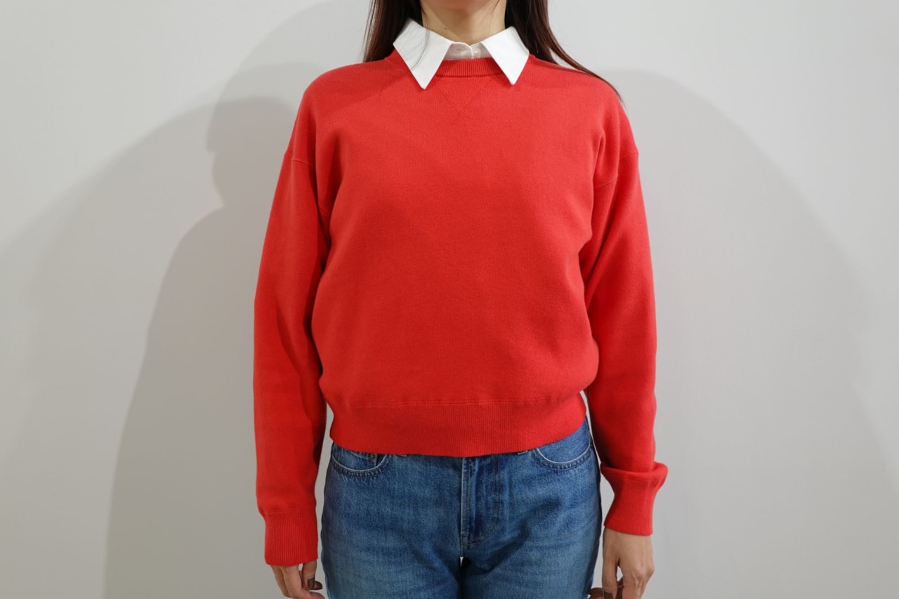 一つ目は、やわらかく肌触りの良いコットン100%素材の「スムースコットンクルーネックセーター」です。スウェットのようなデザインとシルエットで、カジュアルに着こなせる一枚。ショート丈だからどんなボトムスにも合わせやすく、スタイルアップもかなえます。