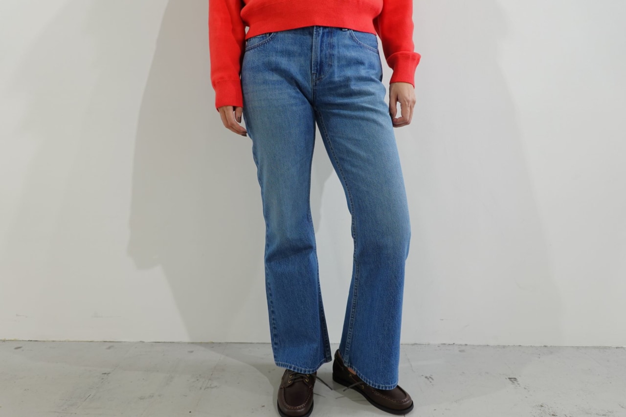 合わせたデニムは、ヒップからももにかけてはスリムフィットに、裾はさりげないフレアなシルエットの「ブーツカットジーンズ」。やや低めのウエスト設定なので、腰回りをすっきりと見せてくれますよ。
