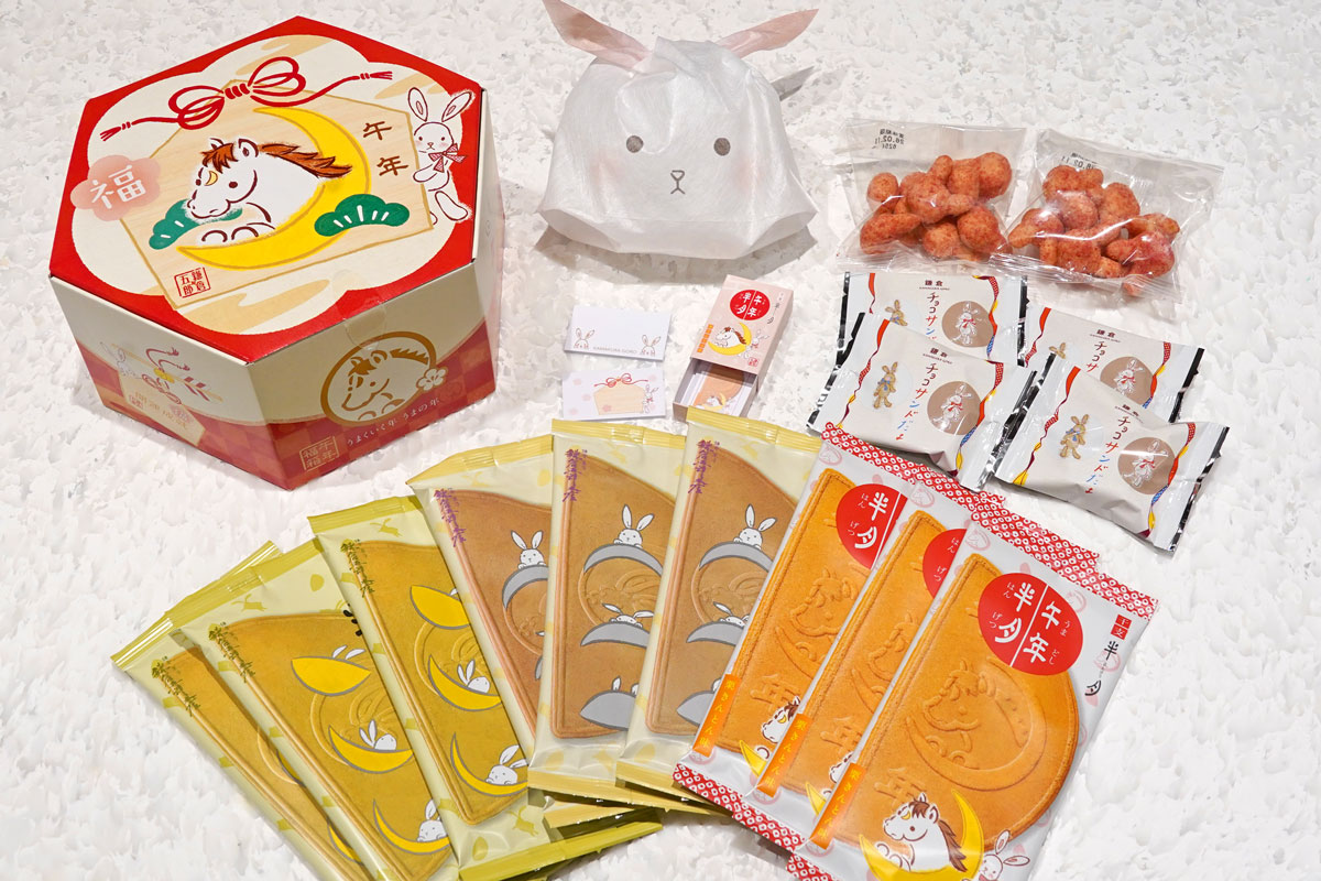 鎌倉五郎のシンボル“月うさぎ”と午(うま)がデザインされた正月らしいパッケージに、毎年大好評だという「干支半月」や代表作「鎌倉半月」をはじめ、しゃりしゃり食感が楽しい「鎌倉チョコサンドだょ」、いちごミルク味のひとくち菓子「うさいちご」が入った新春限定BOXです。