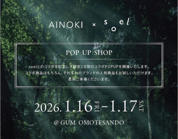 今回、「AINOKI × soel」初のコラボ商品、ロールオン美容液がAINOKI公式オンラインショップにて発売。発売を記念し2026年1月16日・17日、限定コラボPOPUPを表参道で開催します。