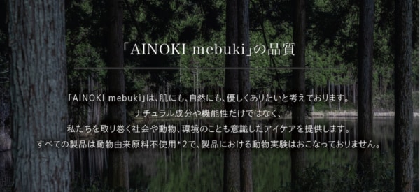 「AINOKI」は、瞳が美しく映える肌のために必要な成分を配合。敏感肌の人でも心地よく使えるように、天然由来成分90%以上、フリー処方などブランド独自の基準を設け自然や動物にも優しいブランドを目指しています。
