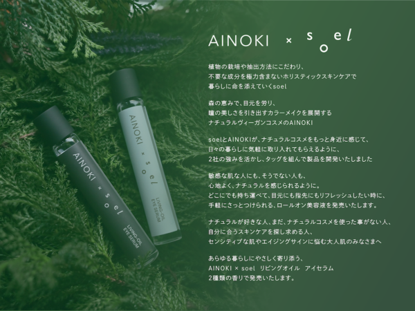 化粧品製造・販売をおこなうジャプロが展開する国産ヴィーガン、ナチュラルオーガニックコスメブランド「AINOKI (アイノキ)」は2026年1月19日、ホリスティックスキンケアブランド「soel」との初のコラボ商品、ロールオン美容液の販売を開始します。