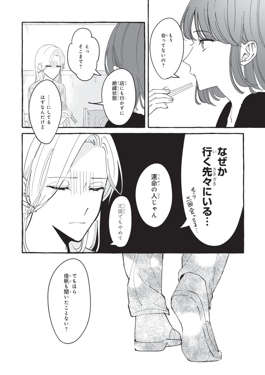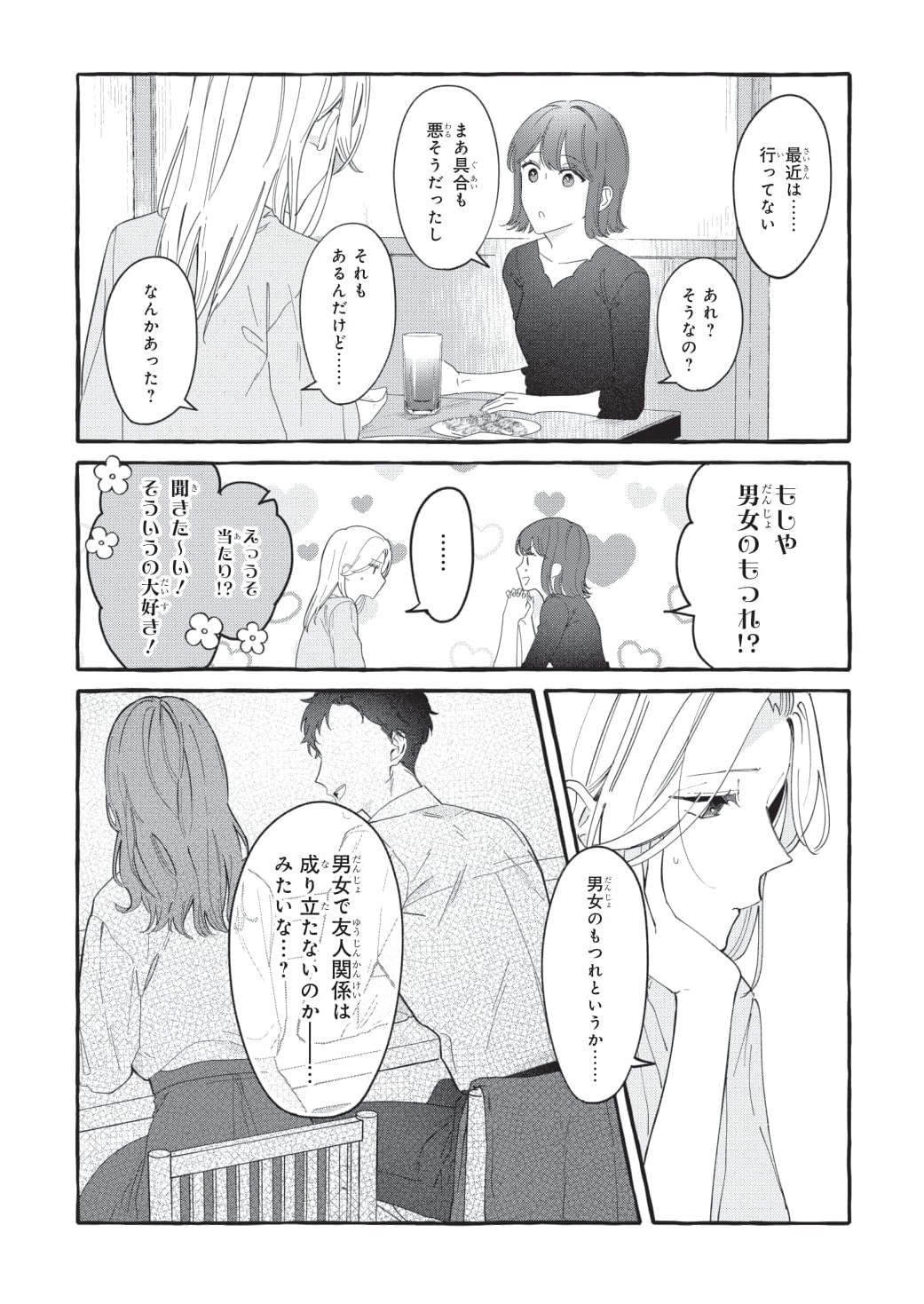 「男女で友情関係は成り立つ?」定番にして永遠のテーマに悩む佳帆。ずっと友人だと思っていた人を、今更別の視点から見ることに迷っているのかもしれませんね。そんな佳帆の背後に見覚えのある人影が見えますが、これは一体……?