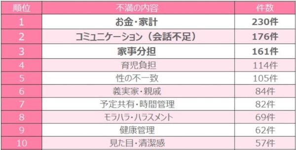 不満上位は「お金」「会話不足」「家事・育児」