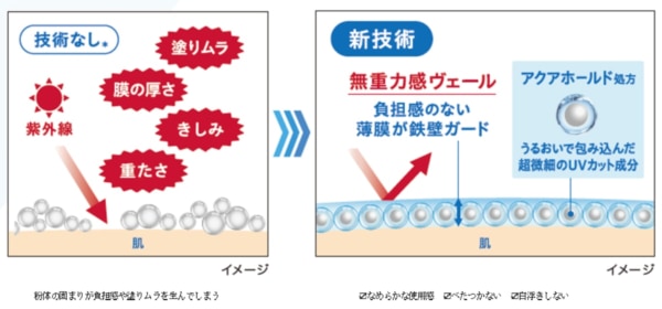 超微細のUVカット成分による「新開発ミクロムースブロック技術」を搭載しており、スッと消えるようになじむ空気のようなつけ心地が特徴となっています。