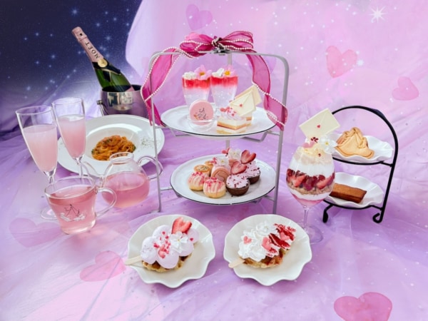 バレンタインをイメージした、ハート型のいちごがのったタルトや、ストロベリーシロップを使用したきらめくオリジナルゼリー、ハートが散りばめられたシュークリームに、ピンクで彩られたロールケーキなど、物語の世界を思わせるキュートなスイーツがティースタンドを彩ります。