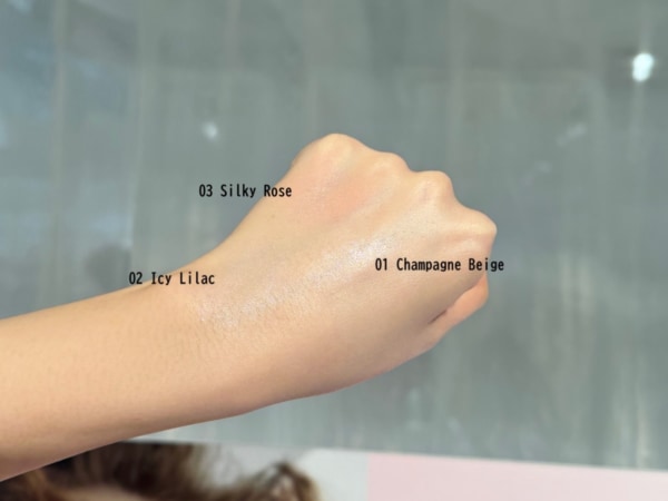 カラーは、多色パールの濡れたような輝きで、ナチュラルにトーンアップする「01 Champagne Beige」、水面のようにクリアな輝きで透明感を生み出す、涼しげなライラックホワイトの「02 Icy Lilac」、ふわっと咲くような血色感でチークとしても使いたいペタルピンクの「03 Silky Rose」の3色展開。