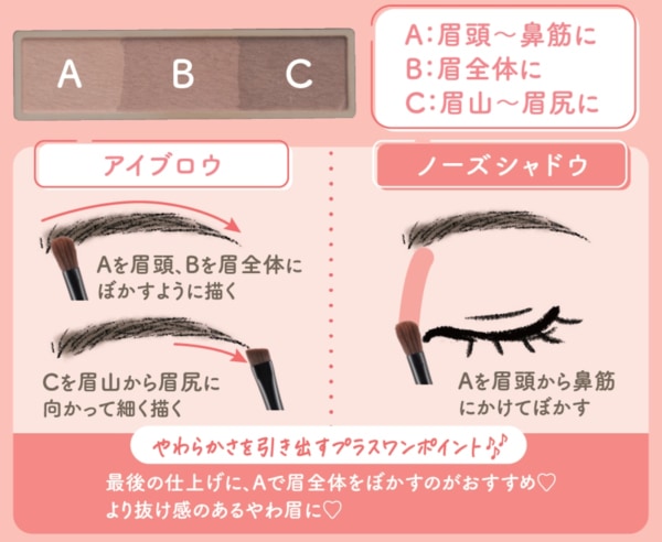 3色重ねるだけで、簡単に自然な立体眉が完成。淡色・中間色と比べ、濃色を肌に馴染む発色に調整しているから、眉全体が濃くなりすぎず失敗しにくい! 球状パウダーを配合しているから、ムラのないふわっと柔らか質感です。