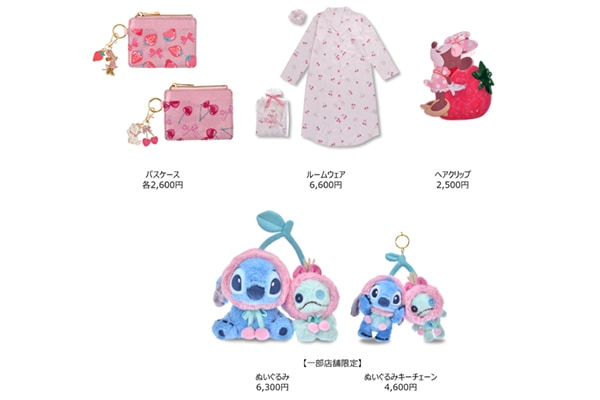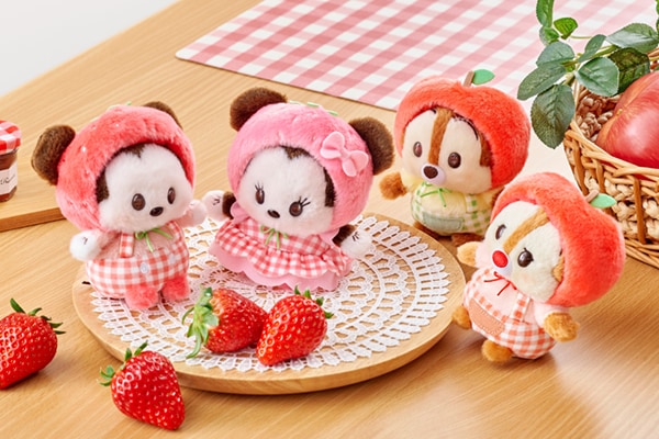 ぬいぐるみやぬいぐるみキーチェーンでは、いちごを抱きしめた「ミニー」や「マリー」、「チップ&デール」が登場。一部店舗限定で、さくらんぼコスチューム姿の「スティッチ」と「スクランプ」のデザインも取り扱います。