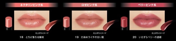 今回登場するのは、ネクタリンのような桃をイメージしたピンク系の「18 とろけ落ちる蜜桃」のほか、ロゼピンク系の「19 口染めライチの甘い罠」、ベリーピンク系の「20 いたずらベリーの道標」の3色です。