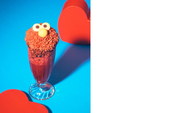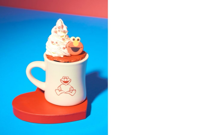 カフェでは、今回のバレンタインコレクションのメインアートをイメージしたハートモチーフのドーナツが登場するほか、エルモそっくりなビジュアルが目を惹くインパクト抜群のベリーシェイク、寒い季節に心もほっと温まるホットチョコレート、限定デザインのキャラクターラテなど、バレンタイン気分を盛り上げるカフェメニューを豊富に用意しました。
