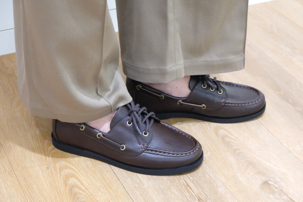 「デッキシューズ」を合わせることによって、一気にマニッシュな雰囲気に。驚いたのはその履き心地。軽量でクッション性もあり、ストレスフリーな履き心地でした。男女兼用で、サイズは22.5〜28cmまであるので、筆者のように足の大きさで悩んでいる人にもおすすめです。