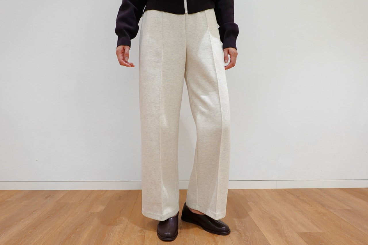 合わせたパンツは、先行発売中でSNSでも話題になった「スウェットストレートパンツ」。履き心地はザ・スウェットなのに、適度なハリ感とセンターラインによってキレイめな印象をプラスします。
