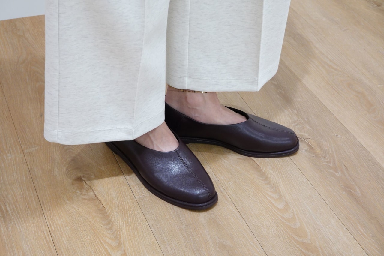 シューズに選んだのは、革調で上品さのある「スクエアフラットシューズ」。やわらかな素材で心地良いフィット感があり、さらに軽いので履き心地は抜群! どんなファッションにも取り入れやすく、「迷ったらコレ」とついつい手が伸びる存在になりそうです。