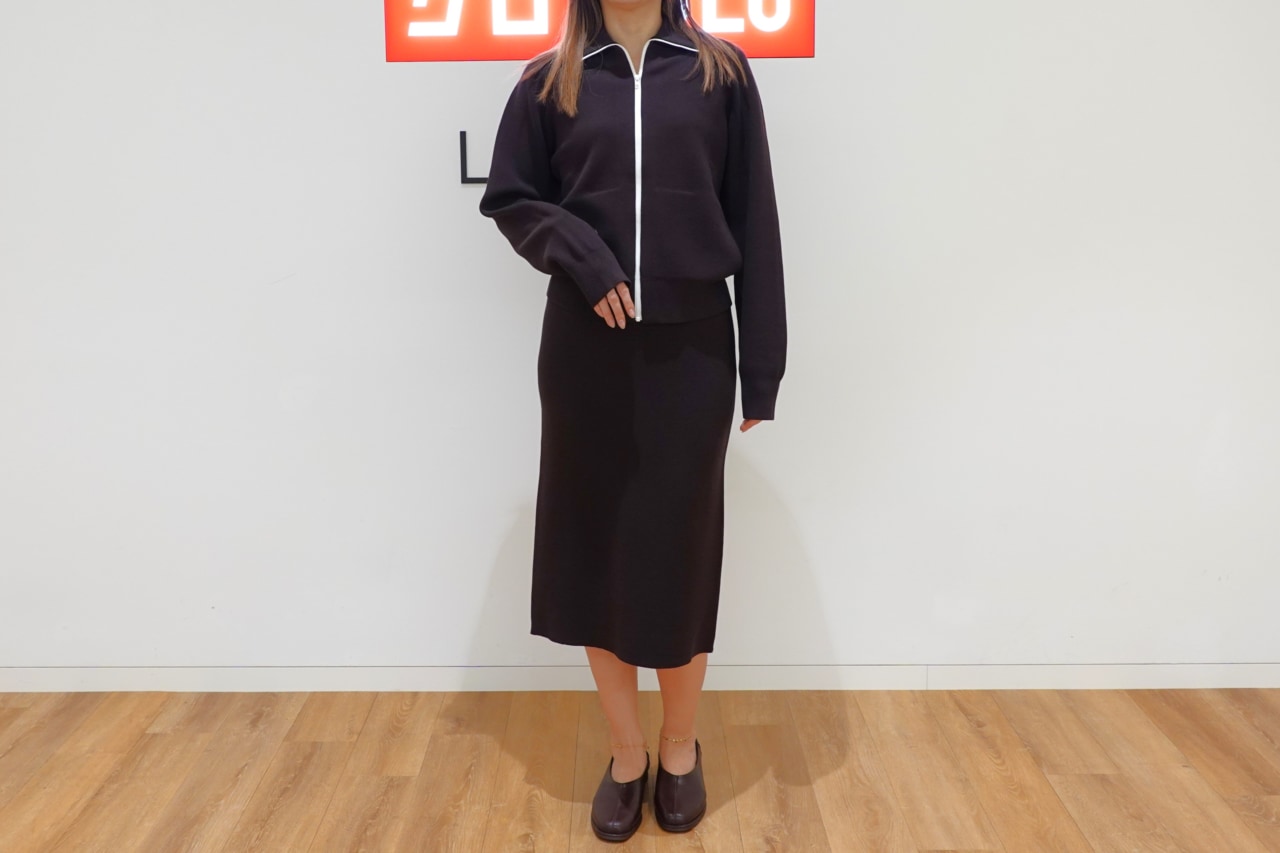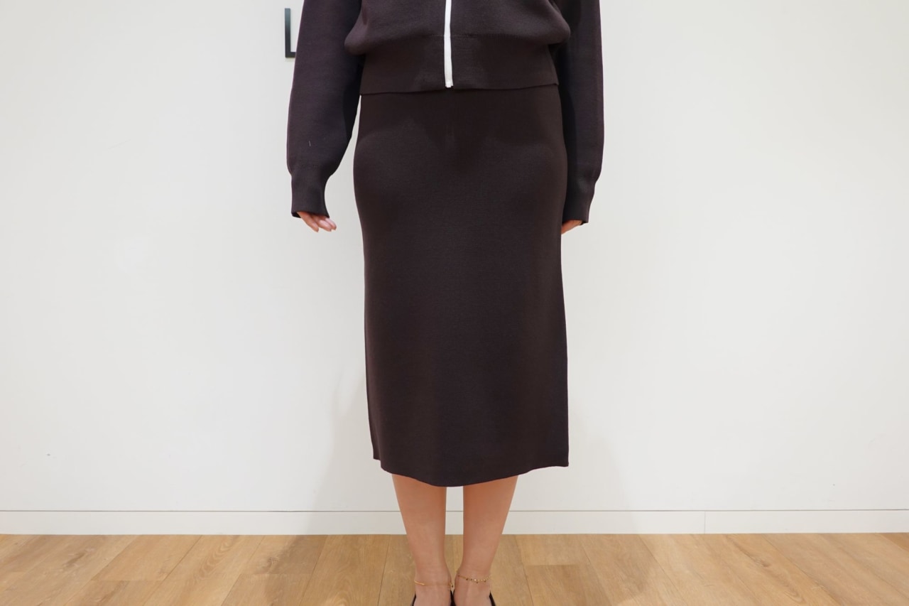 よりすっきりと見せたい時は、「ミラノリブフルジップカーディガン」とのセットアップ使いができる「ウォッシャブルミラノリブスカート」がおすすめです。
