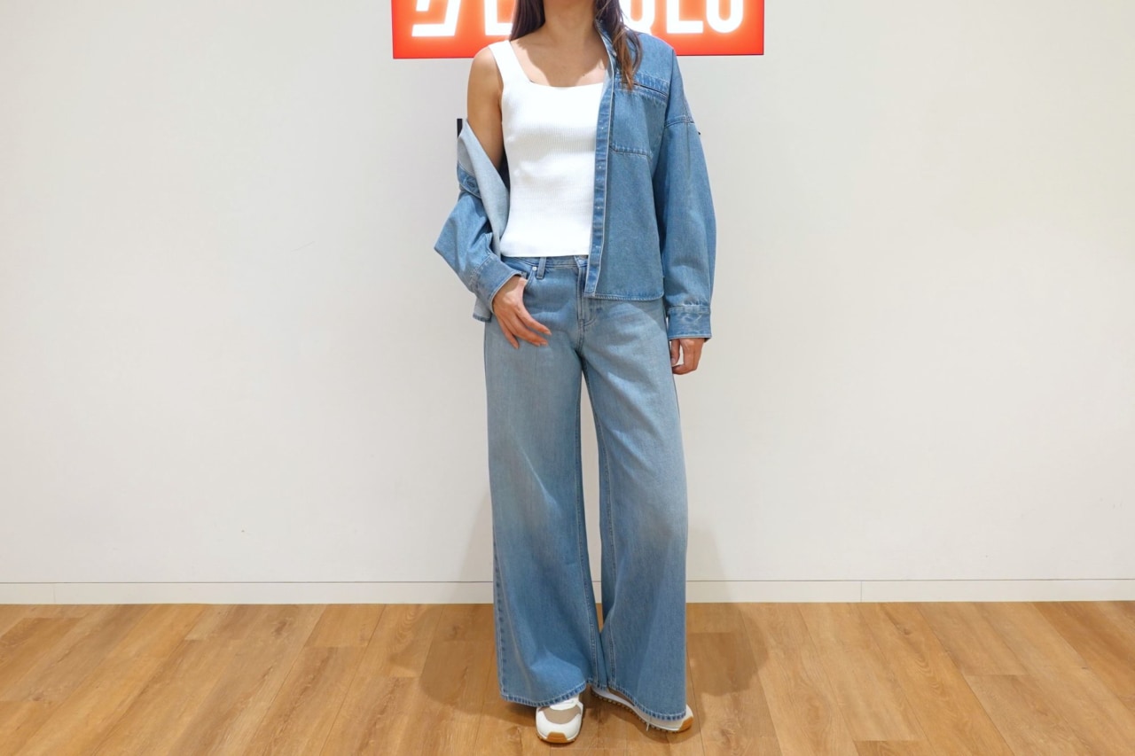 「デニムリラックスシャツジャケット」(ブルー 4,990円 ※一部店舗商品)、「3Dリブスクエアネックセーターノースリーブ」(オフホワイト 2,990円 ※一部店舗商品)、「ローライズワイドジーンズ」(ブルー 4,990円 ※一部店舗商品)、「コンビネーションスニーカー」(ベージュ 4,990円)