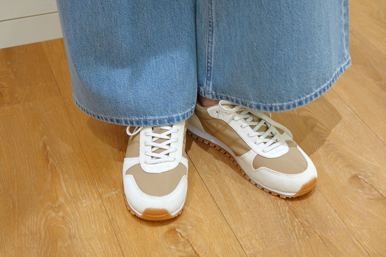 シューズには、ベージュとオフホワイトのバイカラーで、どんなファッションにも合わせやすい「コンビネーションスニーカー」をチョイス。軽量でクッション性もあり、さらに屈曲性も良いので、長時間の移動でも活躍しそうです。
