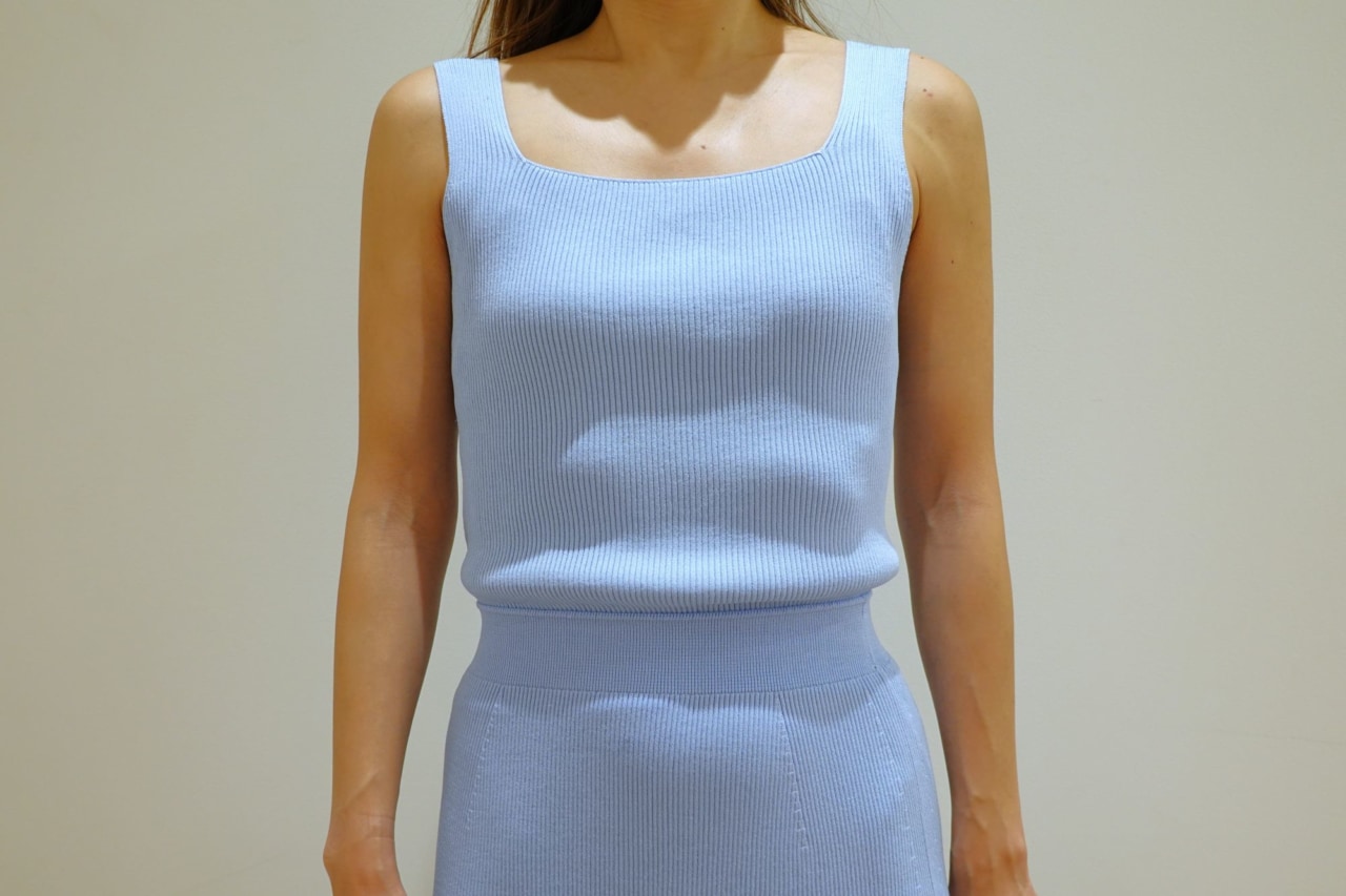 「3Dリブスクエアネックセーターノースリーブ」は、スクエアネックになっているので、デコルテやネックラインがきれいに見えて華奢な印象に。ビスコースブレンドという清涼感と落ち感のある素材を使用していて、サラッと快適な着心地となっていました。
