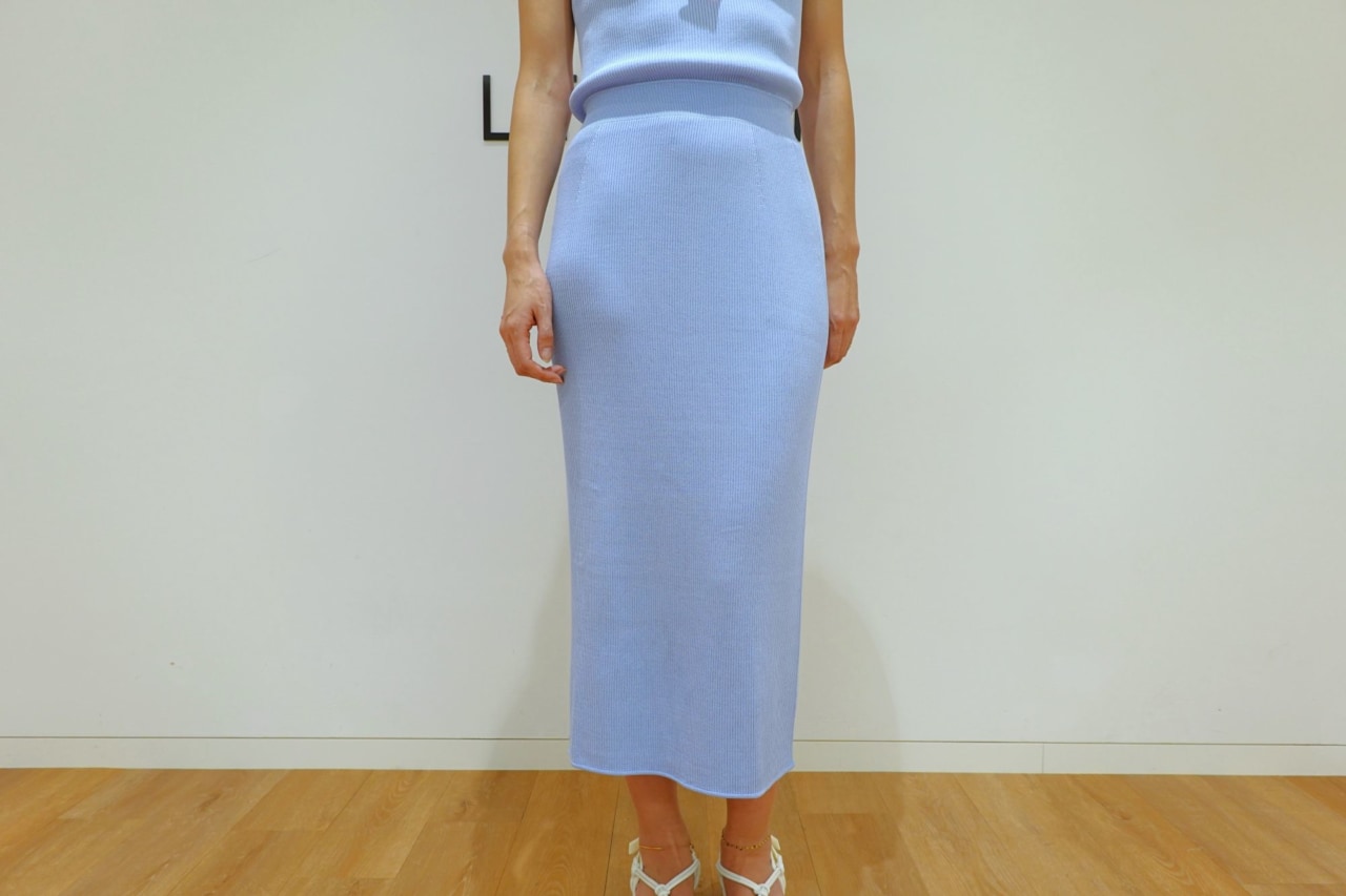 同素材の「3Dリブスカート」は、ナローシルエットのロング丈。3Dニットならではのフラットなウエストで履き心地も良く、すっきりとした印象に見せてくれます。