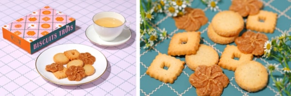 ノスタルジックな印象のデザインには、ふっと笑みがこぼれる遊び心も。「ビスキュイ トロワ」には蝶々が、「マカロンフレーズ」にはうさぎが、それぞれパッケージのどこかに描かれています。