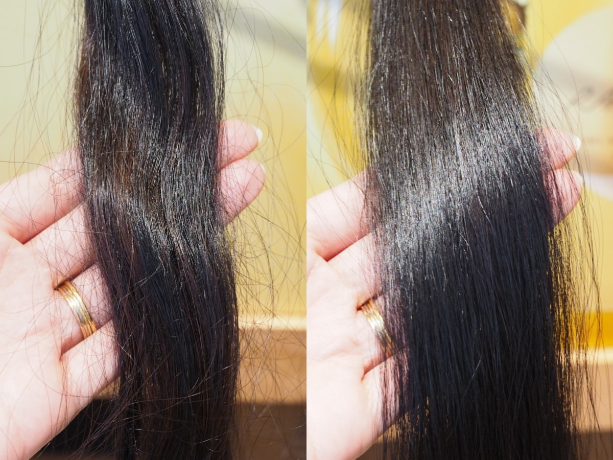 シェンプーとトリートメントを使用したビフォーアフターを見てみると、その違いは一目瞭然。使用前の髪は指通りがイマイチで、ごわつきやうねりが目立ちますが、使用後の髪はなめらかでトゥルンとした指通りに。何度も髪に触れたくなるほどのまとまりとツヤ感をまとっていました。