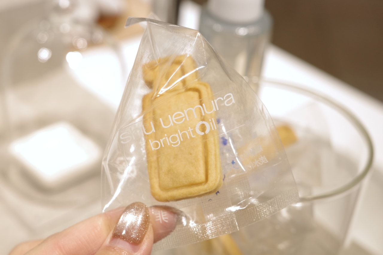 イベントではさまざまな特典が用意されています。ハンドデモを体験し、シュウ ウエムラ公式LINEに登録した方には各日先着順でオリジナルクッキーをプレゼント。クレンジング オイルのボトルをイメージした形がかわいく、「ブライト クレンジング オイル」の配合成分にちなんで酒粕が入ったクッキーです!