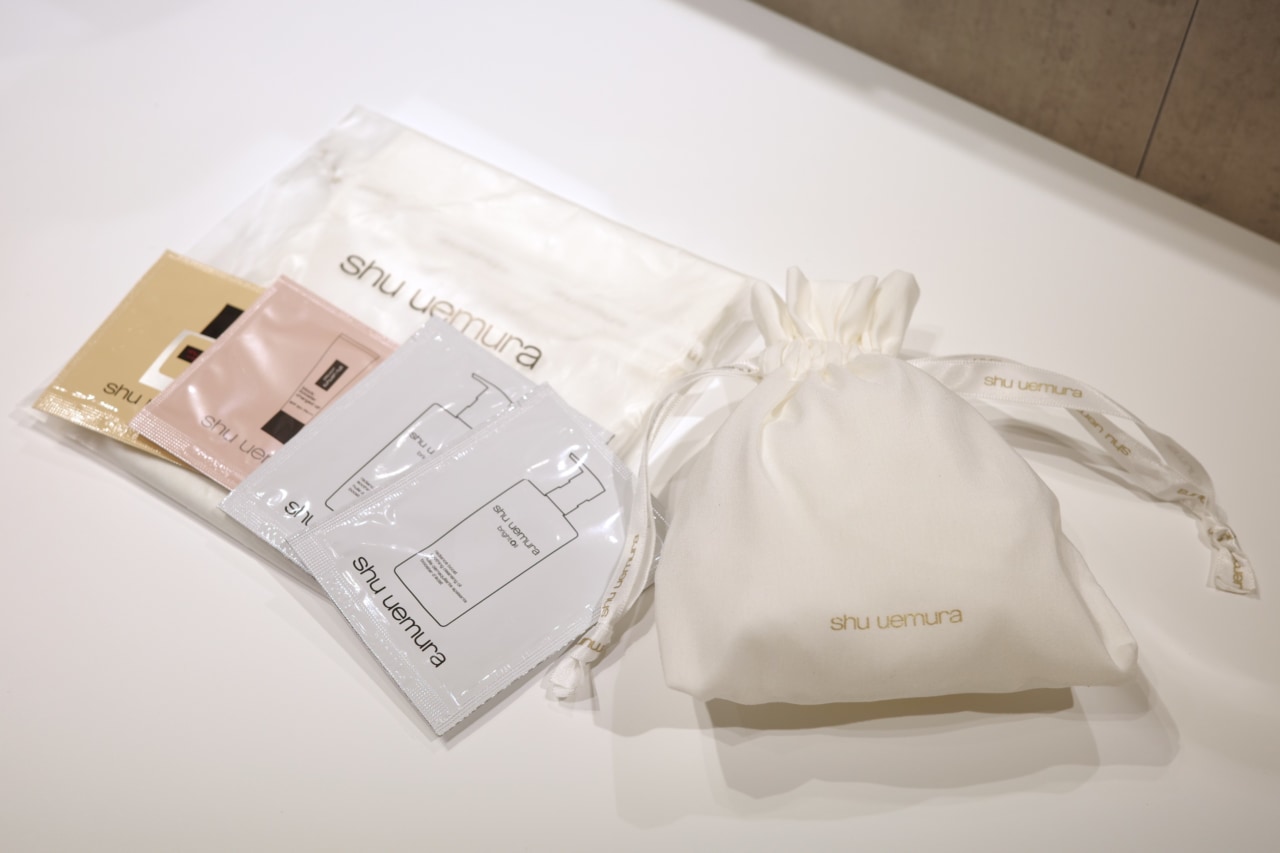 また、イベント限定購入特典が複数用意されています。エムアイアプリ会員で、シュウ ウエムラ製品を購入した方には人気アイテムのサンプルセットをプレゼント。ホワイトを基調にしたミニ巾着もセットになっています。