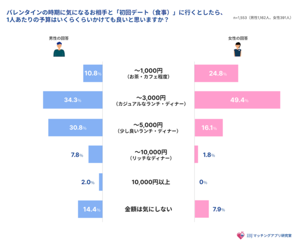 バレンタインの時期に「気になる相手との初回デート予算」について調査したところ、男女ともに「〜3,000円」が最多に。初回デートでは“高すぎないカジュアルな価格帯”を希望する人が多いことがわかりました。
