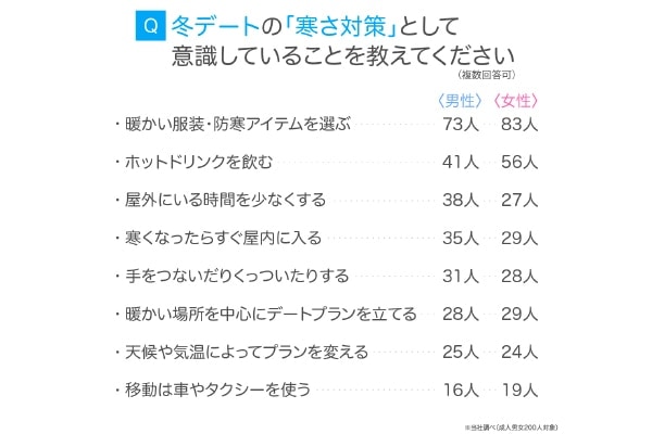 冬デートの寒さ対策として意識していることは、男女ともに「暖かい服装・防寒アイテムを選ぶ」が最多となりました。