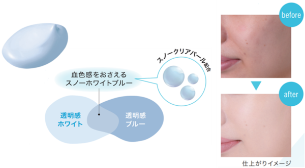 スノークリアパールやアゼライン酸(保湿)を配合し、色だけではなく透明感のある明るさを実現。血色感をおさえて澄んだ肌を演出します。