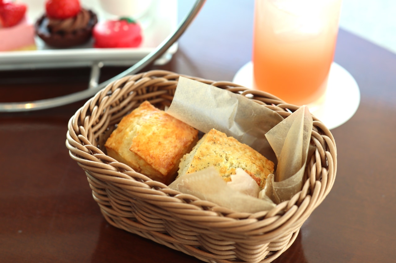ほろっと軽い食感のスコーンは、コンフィチュールをつけると苺とバジルの香ばしさが際立ち、甘さを抑えた味わいに。一方バターはホイップバターのような口当たりで、濃厚なベリーの風味が広がり、トッピングによって異なる味わいを楽しめます。