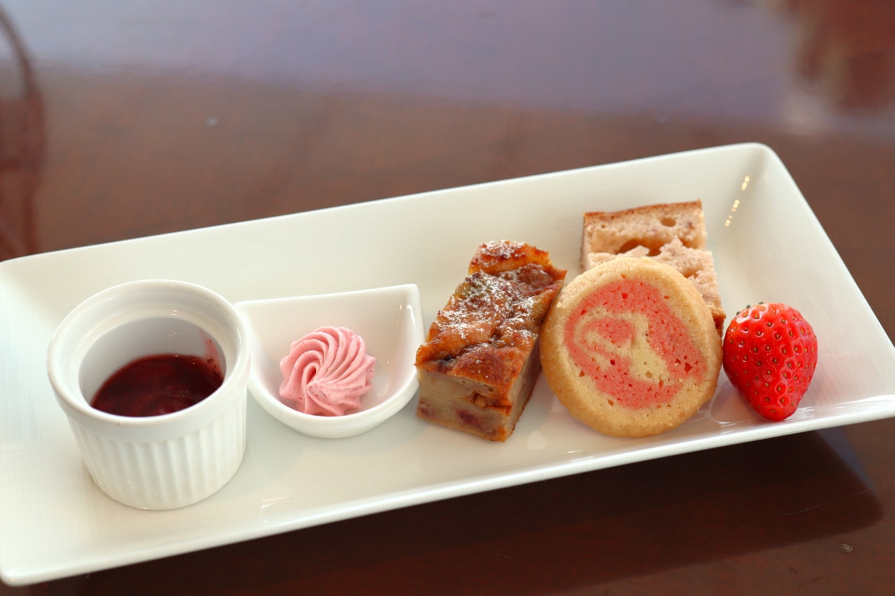 1段目に並ぶのは「苺のパンプティング」「苺のディアマンクッキー」「苺と紅茶のパウンドケーキ」の3種類の焼き菓子。