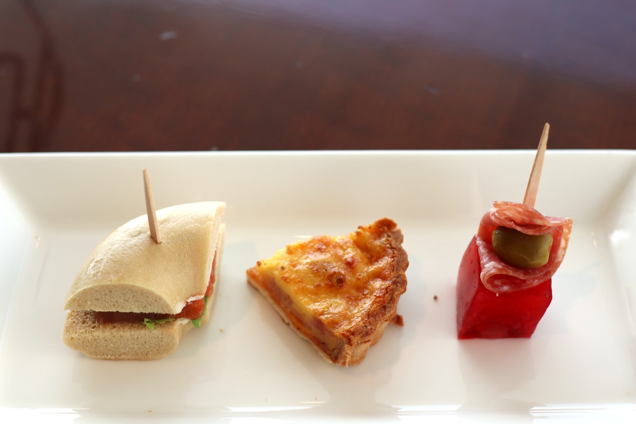 セイボリーは「サーモンとクリームチーズのベーグルサンド」「ドライストロベリーとハム・チーズのキッシュ」「苺ゼリーとサラミのピンチョス」の3種類。ベーグルサンドとキッシュはサーモンやドライストロベリーの赤が差し色になっているのがかわいらしく、春らしさを感じます。