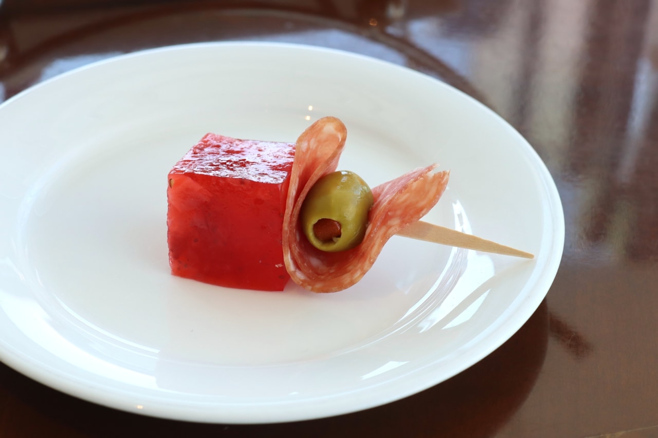 苺のゼリーとサラミの組み合わせは珍しく感じましたが、苺の甘さとサラミと塩気が合わさり、やみつきになる甘じょっぱさ。スイーツの合間に気分を変えてくれる新しい味わいの逸品でした。