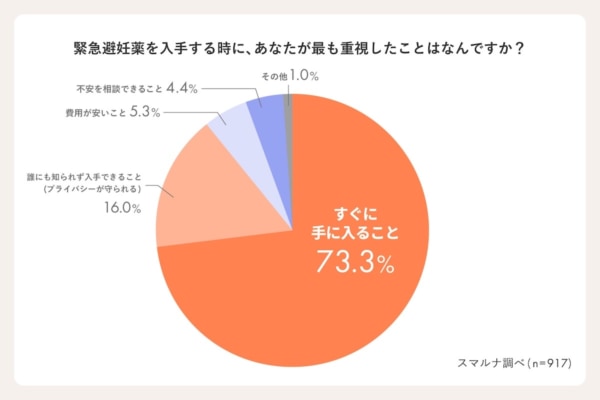 次に、緊急避妊薬を服用したことがある人は、入手にあたって何を重視したかを調査しました。最も重視したことは「すぐに手に入ること」(73.3%)となり、続いて「誰にも知られず入手できる(プライバシーが守られる)こと」(16%)となりました。