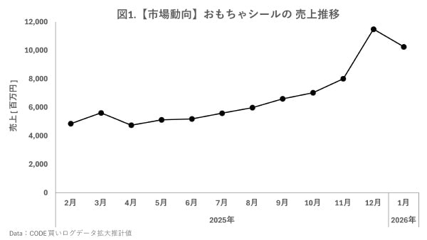 まず、おもちゃシールの売上は昨夏を境に急上昇しており、これまでは特定のアニメファンや子どもたちが中心だった市場の域を飛び出している様子がうかがえます。