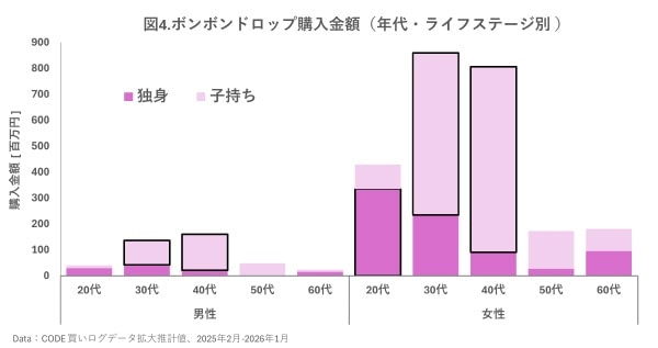 20代以上の購入者については、20代では独身女性の購入が多いのに対し、30代・40代では子持ちの女性や男性の購入も目立つことが分かっています。