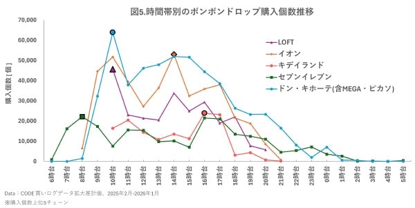 「ボンボンドロップシール」の販売個数が多かった上位5チェーン(LOFT、イオン、キデイランド、セブンイレブン、ドン・キホーテ)を確認したところ、購入個数のピークは1日に「開店直後」と「在庫補充が行われると考えられるタイミング」の2回にわたってあることが分かりました。
