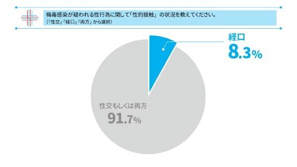 性的接触について性交、経口、もしくは両方を問う質問では、8.3%が経口のみと回答しています。梅毒には咽頭梅毒というものがあり、キスだけでも感染する可能性があるとのこと。
