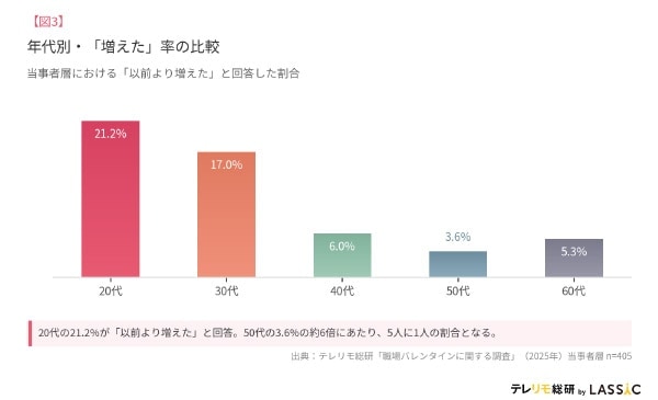 また、職場バレンタインが「以前より増えた」と回答した年代の内訳は、20代が21.2%、30代が17.0%、50代は3.6%となっています。
