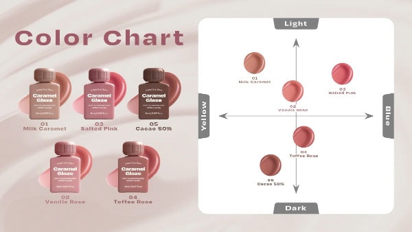 カラー:01ミルクキャラメル、02バニラローズ、03ソルティッドピンク、04トフィーローズ、05カカオ50%