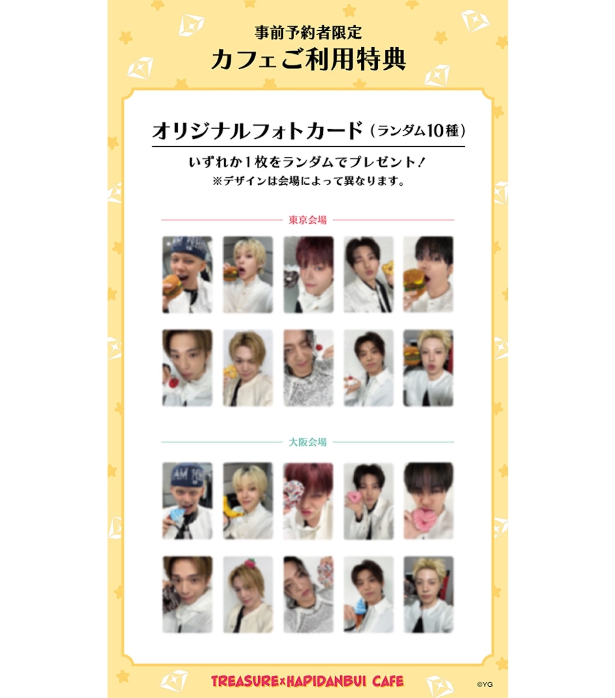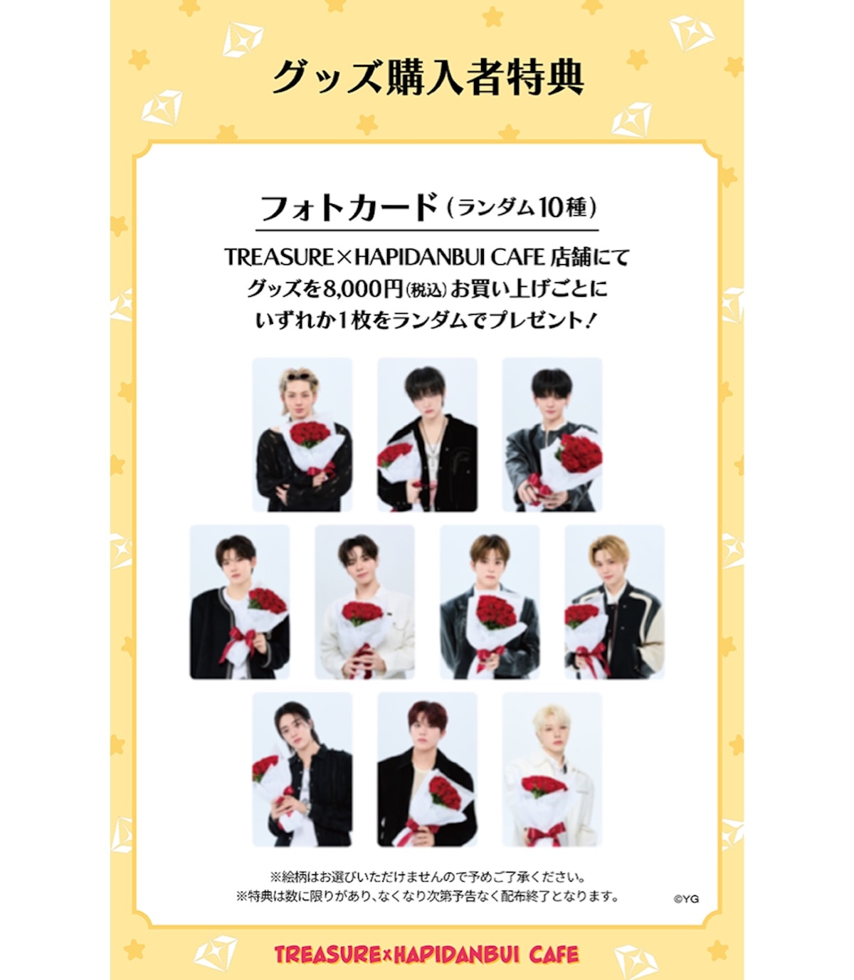 ●グッズ購入者特典:TREASURE×HAPIDANBUI CAFE店舗にて、グッズを8,000円購入ごとに「フォトカード(ランダム10種)」をいずれか1枚プレゼント!(プレゼント枚数上限なし)