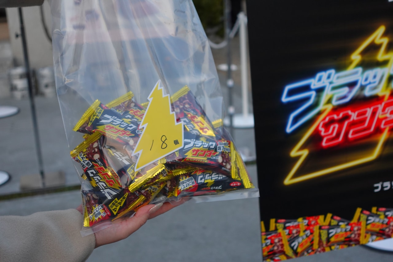 全てのゲームが終了したら、袋詰めコーナーで獲得した数に応じてお持ち帰り用の袋にまとめてもらえます。編集部は4つのゲームで18個のブラックサンダーを獲得することができました!